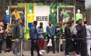 Gwamman mutane ne suka yi layi a harabar ofishin Nike a titin Oxford, da ke Landan, kafin a bude ofishin da safe domin su samu sayen rigar 'yan kwallon na Najeriya.